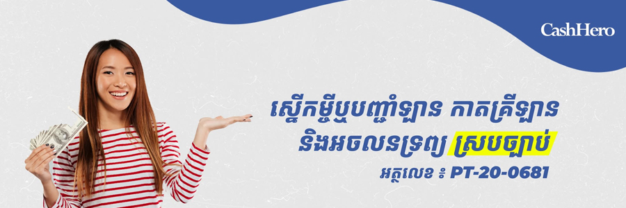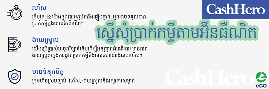 CashHero Co.,Ltd គឺជាក្រុមហ៊ុនមួយដែលត្រូវបានដាក់បញ្ចូលនិងចុះបញ្ជីនៅក្រោមច្បាប់របស់កម្ពុជា។ CashHero ប្រតិបត្តិការវេទិកាផ្តល់ប្រាក់កម្ចីតាមអ៊ីនធឺណិតដែលភ្ជាប់អ្នកខ្ចីជាមួយអ្នកផ្តល់ប្រាក់កម្ចីដែលមានអាជ្ញាប័ណ្ណជួយសម្របសម្រួលដំណើរការឥណទាននិងមិនធ្វើជាអ្នកផ្តល់ប្រាក់កម្ចីឬអ្នកផ្តល់ប្រាក់កម្ចី។
